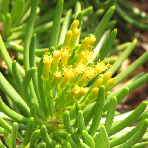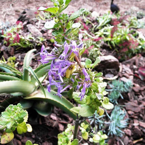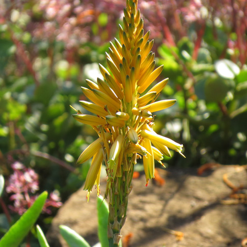 Aloe rupestris, the Kraalaalwyn, or Bottlebrush Aloe. The flowers are outstanding resembling short, cylindrical tubes, quite broad, either orange or yellow and all with dark red extended stamens that give this Aloe an attractive bicoloured effect. Flowering takes place in August and September when many winter flowering species have completed their show. Mature leaves are erect and spreading, and in cultivation, the Bottlebrush Aloe grows to just over 2 m in height.The red and green leaved Kalanchoe sexangularis tuck in around the stems of these larger species creating a neat border viewable from the bench nearby. It comes as quite a surprise in winter to see yellow flower heads forming on the maroon-green leaves, an unusual and striking colour combination. Alongside are 3 Aloe dyeri filling a small area of partial shade; this spotted ground Aloe has tall, slim columns of red flowers in early autumn.