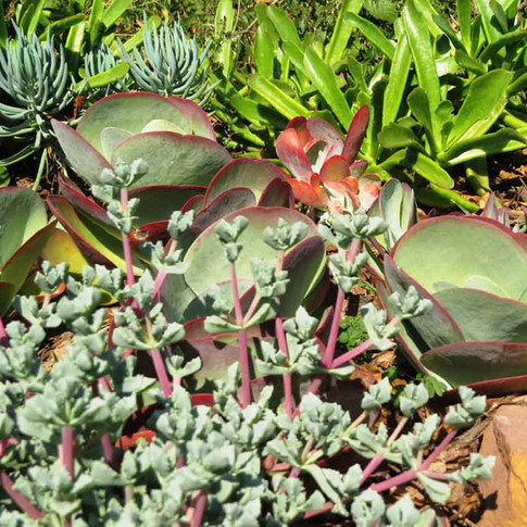 This design focused on arranging combinations of leaf colour with flower colour more or less ignored– a mix of old favourites and new discoveries. It is always so exciting to receive a delivery of plants, offload them alongside each other, and in so doing, discover a new combination. The matching of Oscularia deltoides, Kalanchoe thyrsiflora, and Senecio crassulifolius was one such find. The greys and blues complement each other so well, touched off by soft silver and a dash of maroon, and the resultant mix is magnetic. In spring tiny pink and white daisy flowers cover the unusually shaped leaves of Oscularia, a little groundcover that hugs the ground and never gets out of hand. Relatively slow growing, it is easy to control in a confined space like a rockery. Here, the two colour palettes of the Silver Lady, Kalanchoe thyrsiflora, indicate how water and temperature fluctuations affect the leaf colour of many succulents. One group still wearing summer’s apple green we sourced from a coastal nursery; the other, sourced from inland of Pietermaritzburg, has already donned the red winter coat. The dwarf hybrid form of the Spekboom, Portulacaria afra ‘Nana,' a lovely dark-leaved succulent with a prostrate growth habit for stabilising banks, rehabilitates and restores soils, covers the ground between the taller species. As with its larger sibling, the dwarf Spekboom stores carbon.