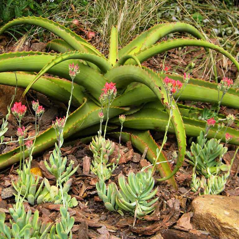 Curio (Senecio) crassulifolius sits at the foot of the Kraalaalwyn, its plump blue fingers toning down the hot yellows and reds. Cotyledon barbeyi, or Plakkies, introduces beefy finger-like leaves of bright green and from March to September add flowers in a red to a coppery sheen that resemble hanging bells. Alongside is the superb Octopus Aloe, Aloe vanbalenii, whose tall stemmed flowers of yellow or orange brighten the garden from June to August. The amount of shade influences the leaf colour – red during times of drought and in bright sun, light green when slightly shaded or during the rainfall season. Deeply channelled leaves grow long thin tips that twist around and touch the ground. Thorncroftia succulenta will create a soft grey/green backdrop shrub behind the Aloe. Flowering from February to June, the purple tubular flowers will add a soft contrast to the hot colours that dominate. Crassula alba wearing its richly jewelled coat through April and May nestles in a rocky bed of its own the colours enhanced by another dove grey Oscularia spilling over a rock into the platform below. Aloe vanbalenii, hugged by the pale green leaves of Kalanchoe rotundifolia (previously K. decumbans, complete the last rock-pocket section. Flowers of this little groundcover are neon red-pink and form at the top of delicate stalks, well above the rounded leaves. A quite beautiful combination. Blond to green fronds of the odd NGongoni grass, Aristida junciformis, punctuate the display bringing in movement to the rather static forms of the succulents, and help to break up the strong form and colour of the succulents. That said, no other plant category adds the rich variety of colour with leaves alone. If you have even the smallest suitable space, treat yourself to a succulent paintbox!